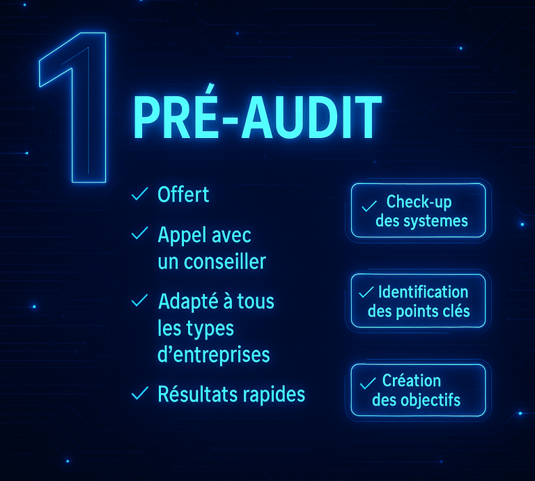 Chaque seconde compte. Sécurisez votre entreprise dès aujourd’hui avec un pré-audit offert. Les cybermenaces évoluent vite, et chaque retard peut exposer vos données, vos clients et votre réputation. Ne laissez pas le hasard décider de votre sécurité. Grâce à notre pré-audit, nos experts identifient vos vulnérabilités et vous donnent une vision claire de votre niveau de protection. Une seule action suffit pour anticiper les risques et renforcer vos défenses. Contactez-nous maintenant avant qu’il ne soit trop tard.